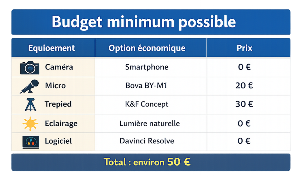 Il est possible de réaliser une vidéo de présentation avec un budget très limité. Avec un smartphone récent, un micro-cravate d’entrée de gamme et un trépied, il est possible d’obtenir un résultat convaincant pour environ 50 à 100 €. Pour une qualité plus avancée (éclairage LED, appareil hybride, accessoires), le budget peut monter entre 300 € et 1000 €.
